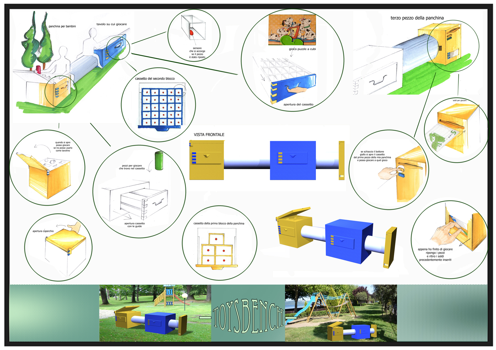 Panchine per bambini Progetto della toysbench, panchina realizzata per far giocare i bambini al parco con un meccanismo di apertura di cassetti contenenti puzzle, pezzi ad incastro etc. I cassetti si aprono solo se si inseriscono i soldi e solo se si ripongono tutti i pezzi del gioco la panchina li restituisce |