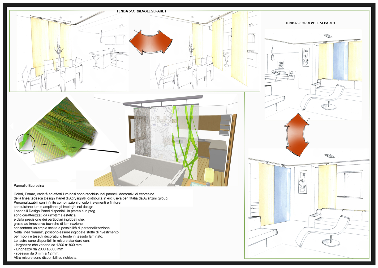 Progetto tenda scorrevole/separé Abitazioni sempre più piccole rendono necessari l'utilizzo degli spazi al meglio. L'idea è stata di realizzare un binario a soffitto che mi permettesse di trascinare le tende dalla finestra al centro della stanza per utilizzarle come separé, il materiale non è la classica stoffa ma bensì un materiale semirigido di ecoresina con inserti di diversi materiali. Il pannello in eco resina è sorretto da un pannello contenente il meccanismo di rotazione della tenda. |
